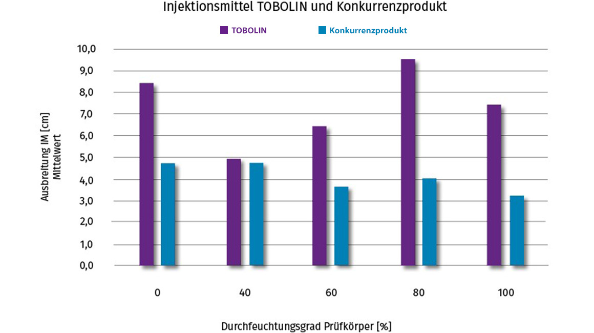 Im Rahmen einer wissenschaftlichen Studie wurde die Horizontalsperre von TOBOLIN mit einem bekannten Konkurrenzprodukt verglichen. Dabei wurden beide Erzeugnisse auch hinsichtlich der Effektivität ihrer wasserabweisenden Wirkung geprüft. Beide Produkte wiesen zweifelsfrei hydrophobe (wasserabweisende) Eigenschaften auf. Im Ausbreitungstest zeigten mit TOBOLIN behandelte Proben einen bis zu doppelt so hohen Abschirmungsbereich im Vergleich zu Proben, die mit dem Konkurrenzprodukt behandelt wurden.