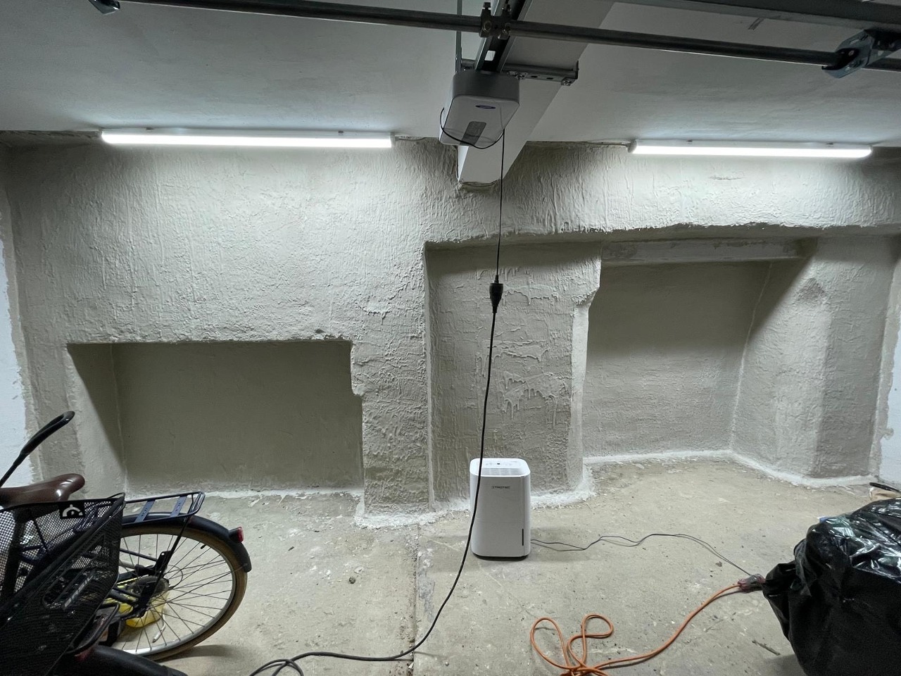 In diesem idealtypischen Kundenfall zeigt sich deutlich, weshalb eine Abdichtung von innen eine effektive und erfolgreiche Lösung darstellen kann. Die Garage hat eine Hanglage, wodurch bei Regenfällen dauerhaft Wasser gegen die Rückwand gedrückt wird und feuchte Stellen entstehen. Besonders in den Ecken dringt dadurch Feuchtigkeit ein – es bilden sich sogar Pfützen im Inneren. Eine Abdichtung von außen wäre mit erheblichem baulichem Aufwand verbunden und aufgrund der dahinterliegenden Mauer nahezu unmöglich umzusetzen. Oft existiert gar kein Zugriff auf das angrenzende Grundstück.