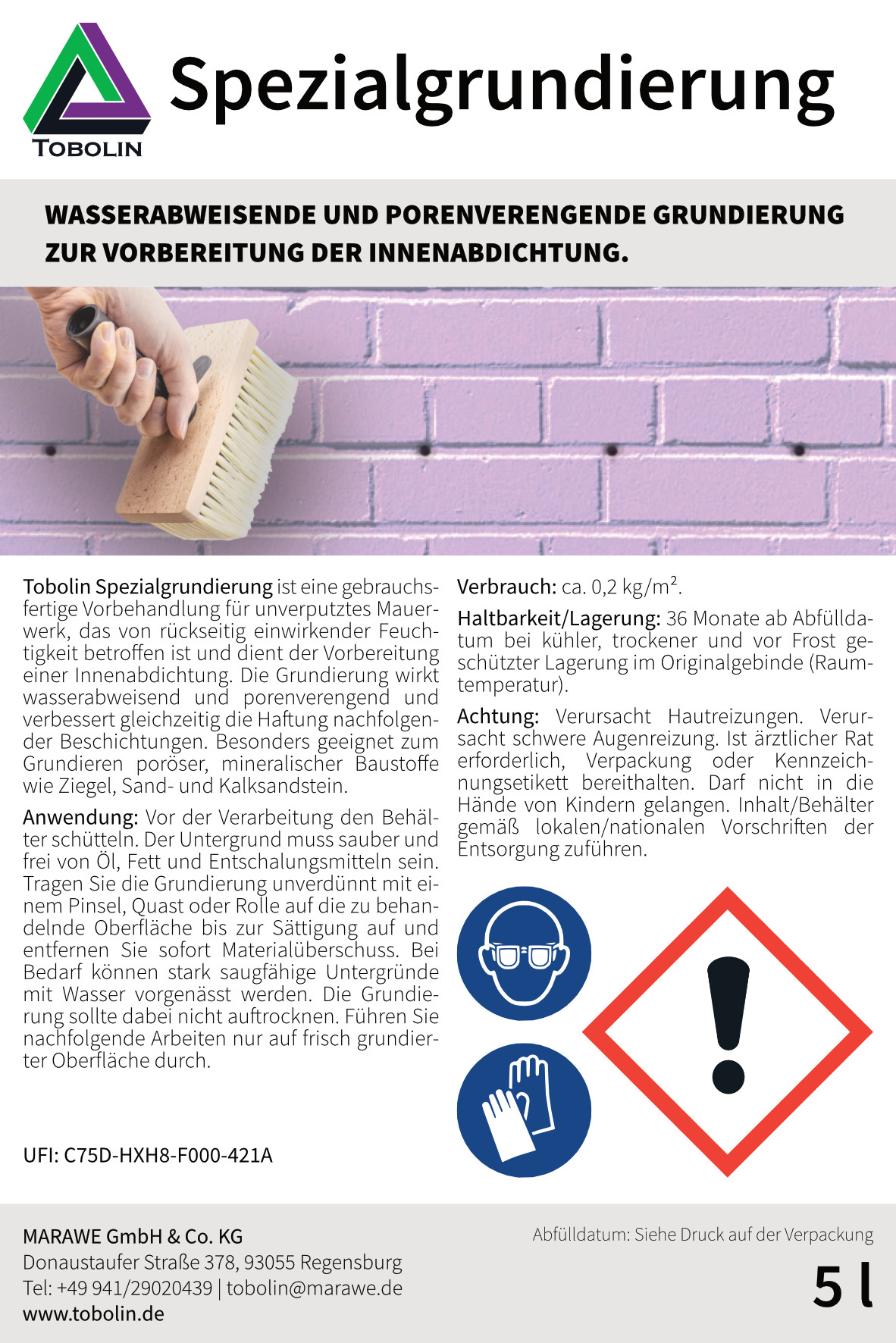 - KOMPATIBILITÄT: TOBOLIN Spezialgrundierung dient zur Vorbehandlung der Wand und kann hervorragend in Kombination mit dem TOBOLIN Sperrputz verwendet werden.