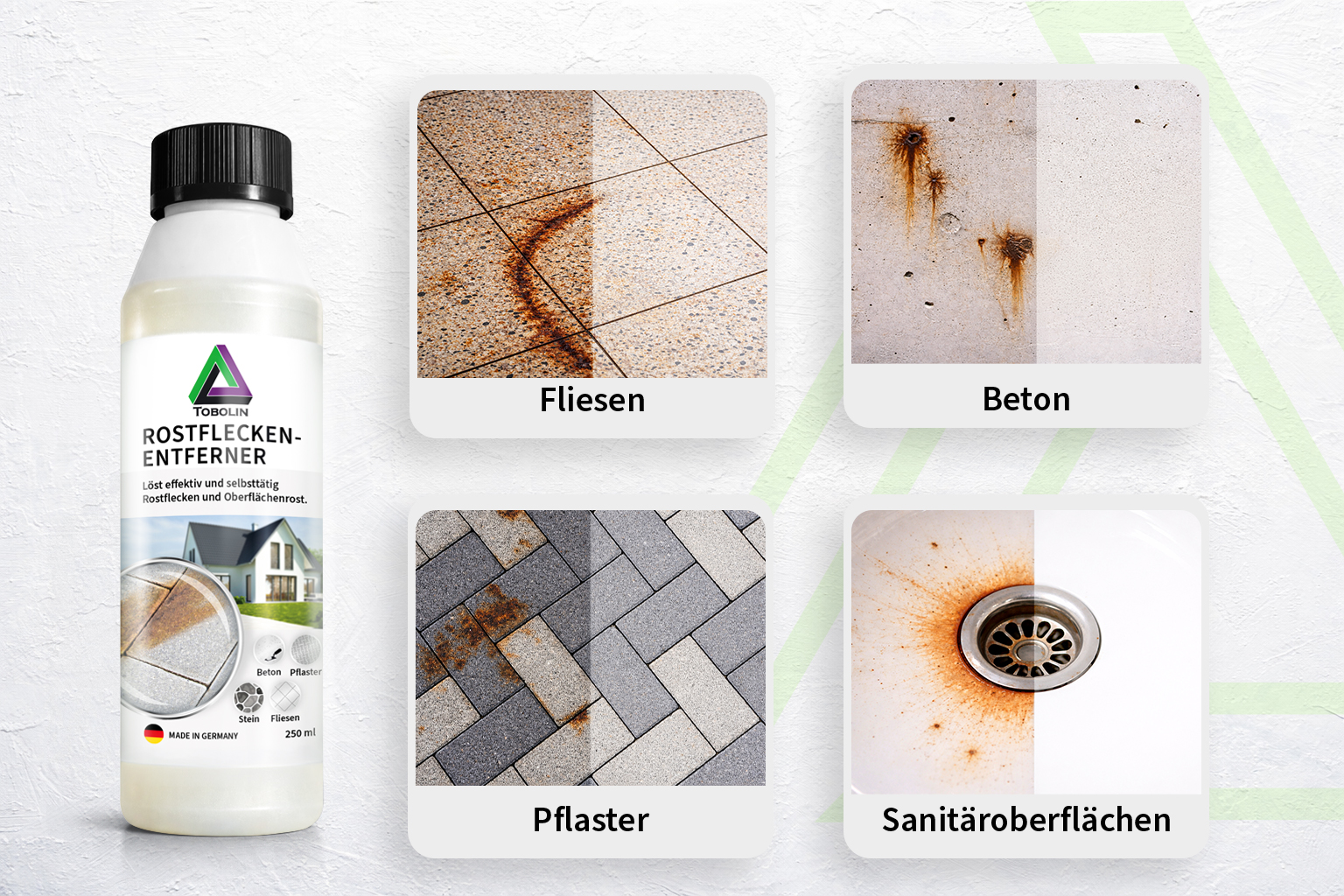 - AKTIVFORMEL GEGEN ROSTFLECKEN: Unser TOBOLIN Rostfleckenentferner löst Rostverfärbungen und eisenhaltige Rückstände dort, wo milde Reiniger oft an ihre Grenzen kommen – ideal für punktuelle Flecken auf Außenbelägen rund um Pflaster & Fugen.